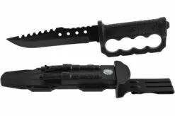 Cet accessoire de survie est également optimisé pour le combat, notamment grâce à sa remarquable poignée type “poing américain”. Ce couteau possède une lame traditionnelle d’un côté, rigide et tranchante, et de l’autre des dents de scie permettant de découper quelque chose sans avoir à appliquer de pression.