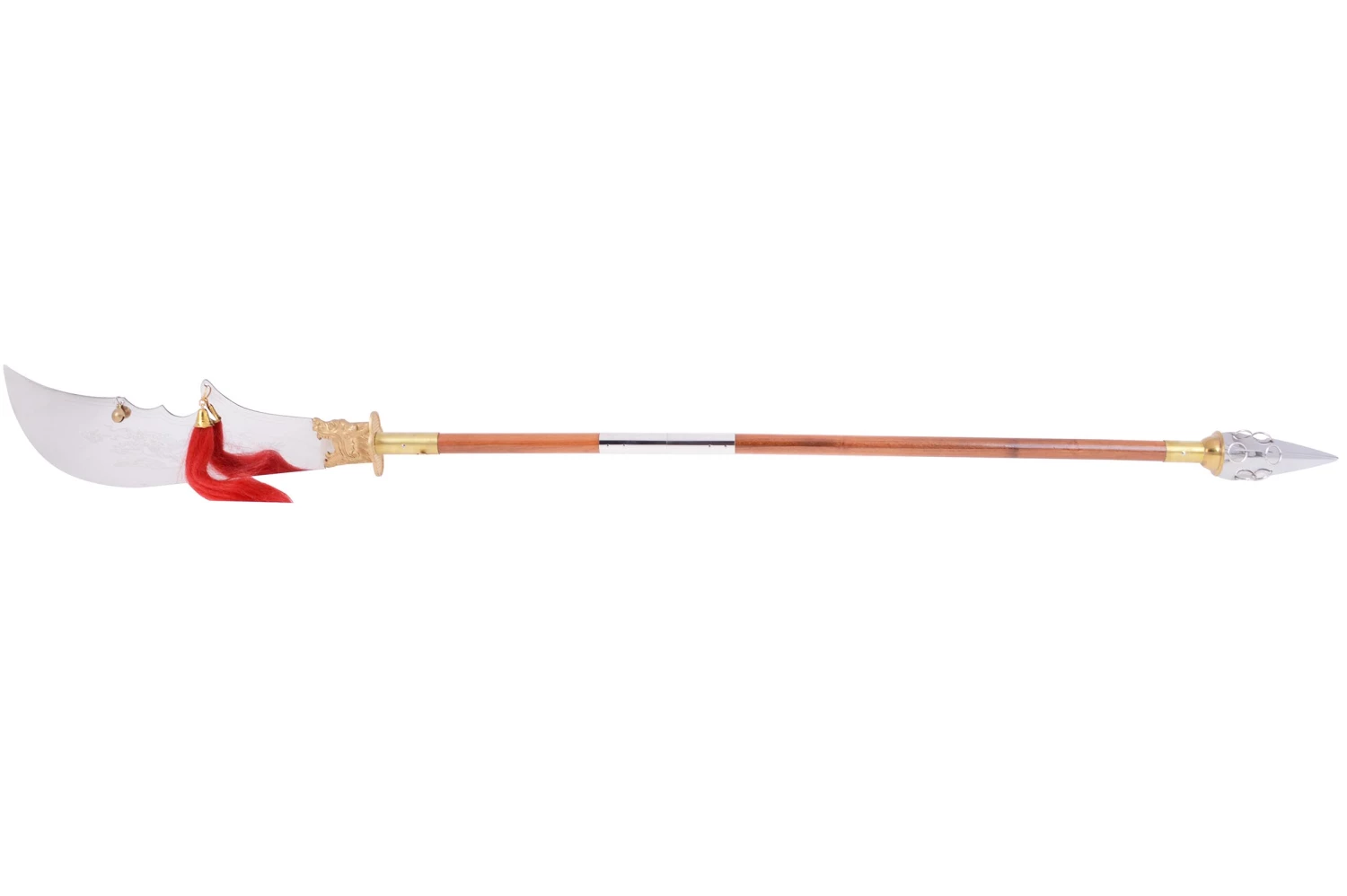 Hallebarde démontable à lame inox rigide (tendant vers semi rigide) avec une garde en alliage cuivre. Longue et légère. Facilement montable et démontable en 2 parties grâce à un pas de vis.