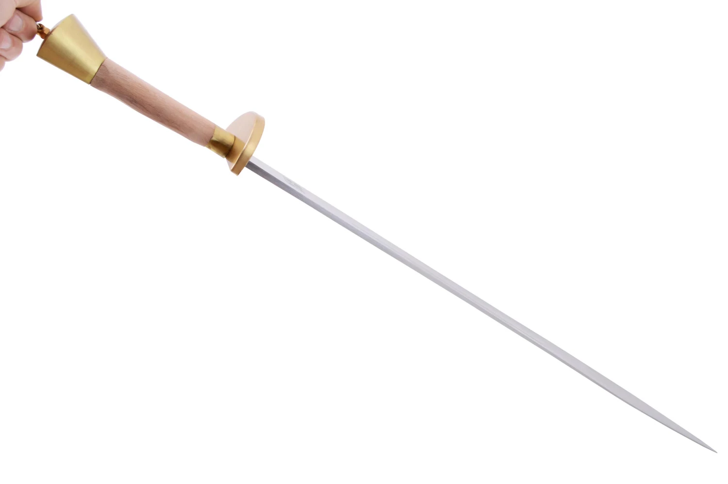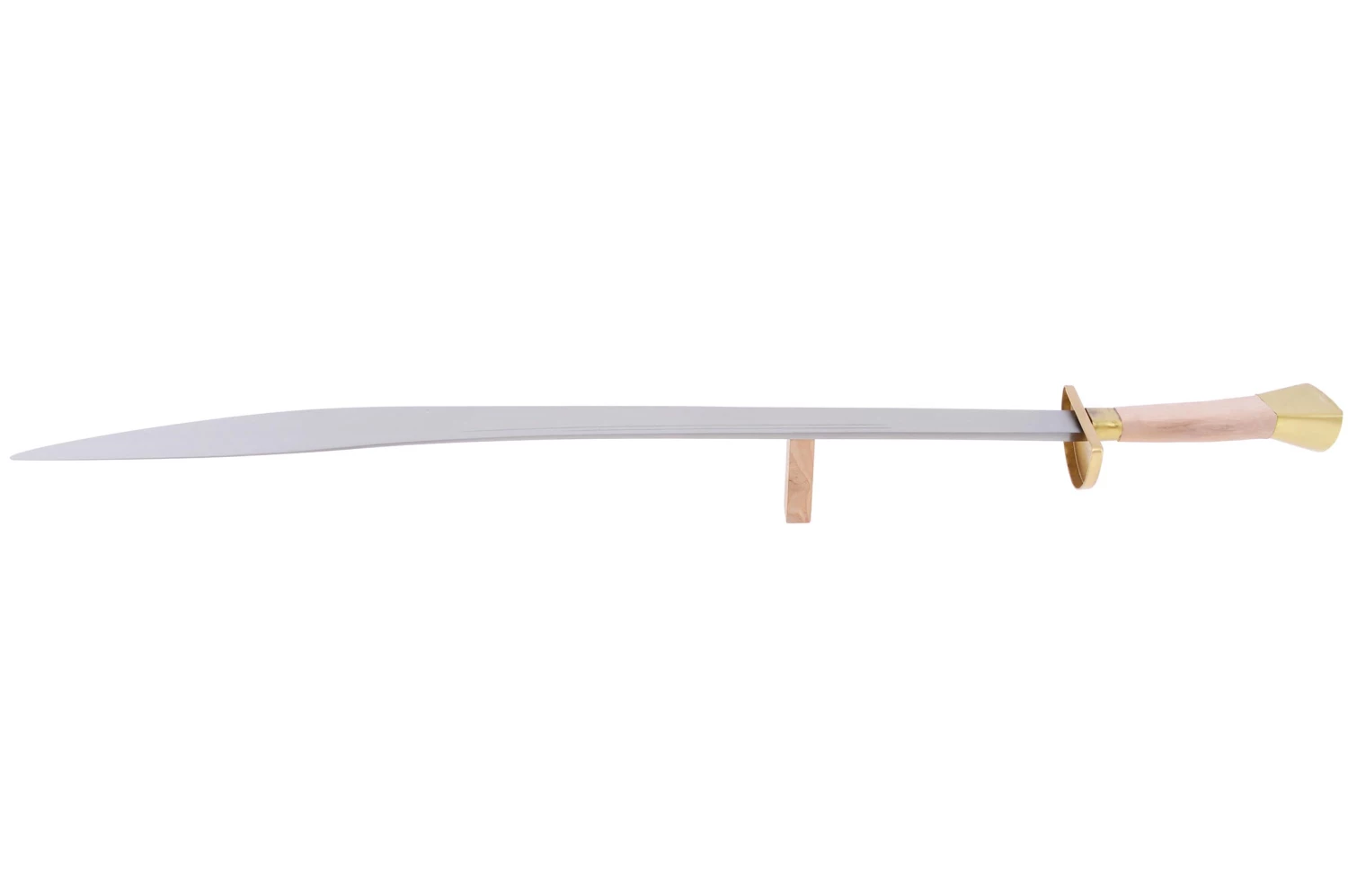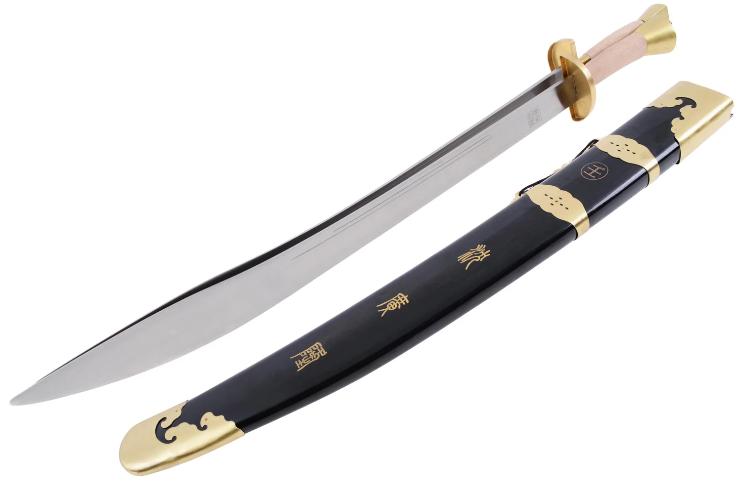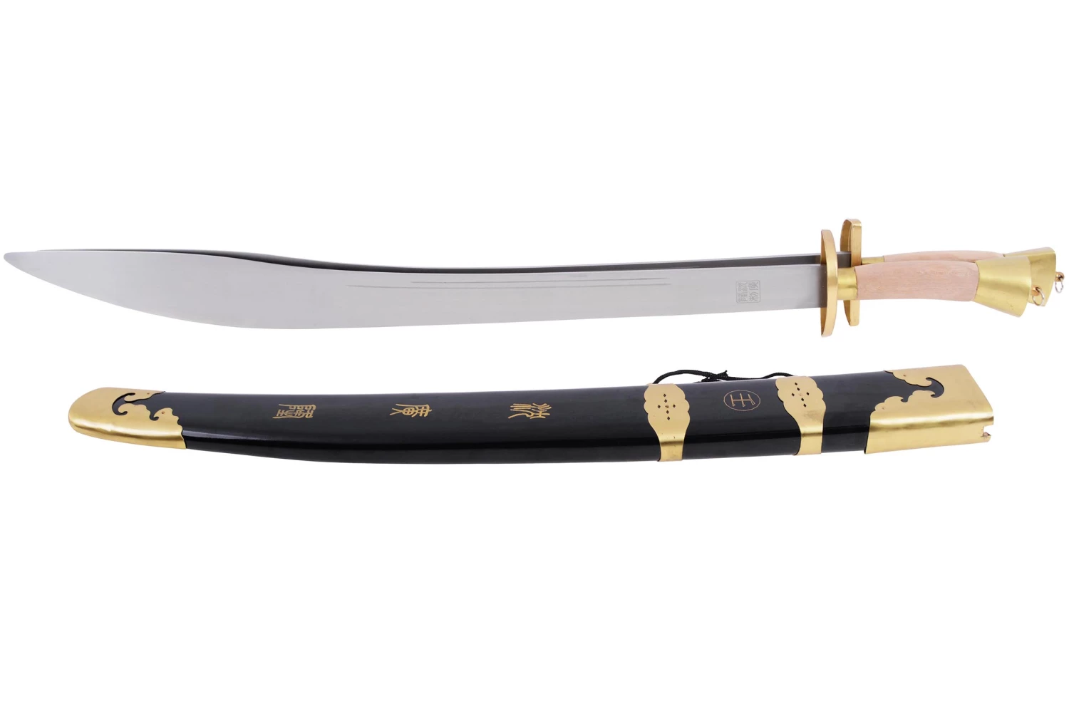 Double sabre style du nord, de type traditionnel avec lame rigide, en acier forgé très robuste. Les poignées et les gardes sont aplaties sur leur face intérieure et sur toute leur longueur. Les deux sabres sont stockées dans un seul fourreau. Cette arme est forgée à Longquan.