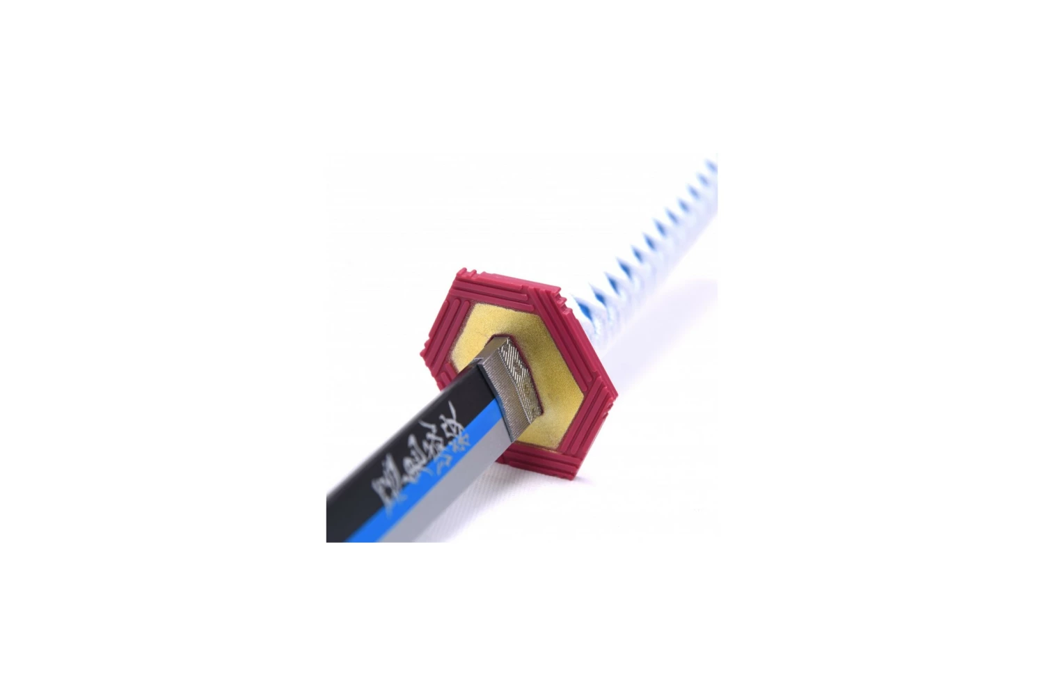 Le manche (Tsuka) est en PVC bleu surmonté d’un cordage blanc.