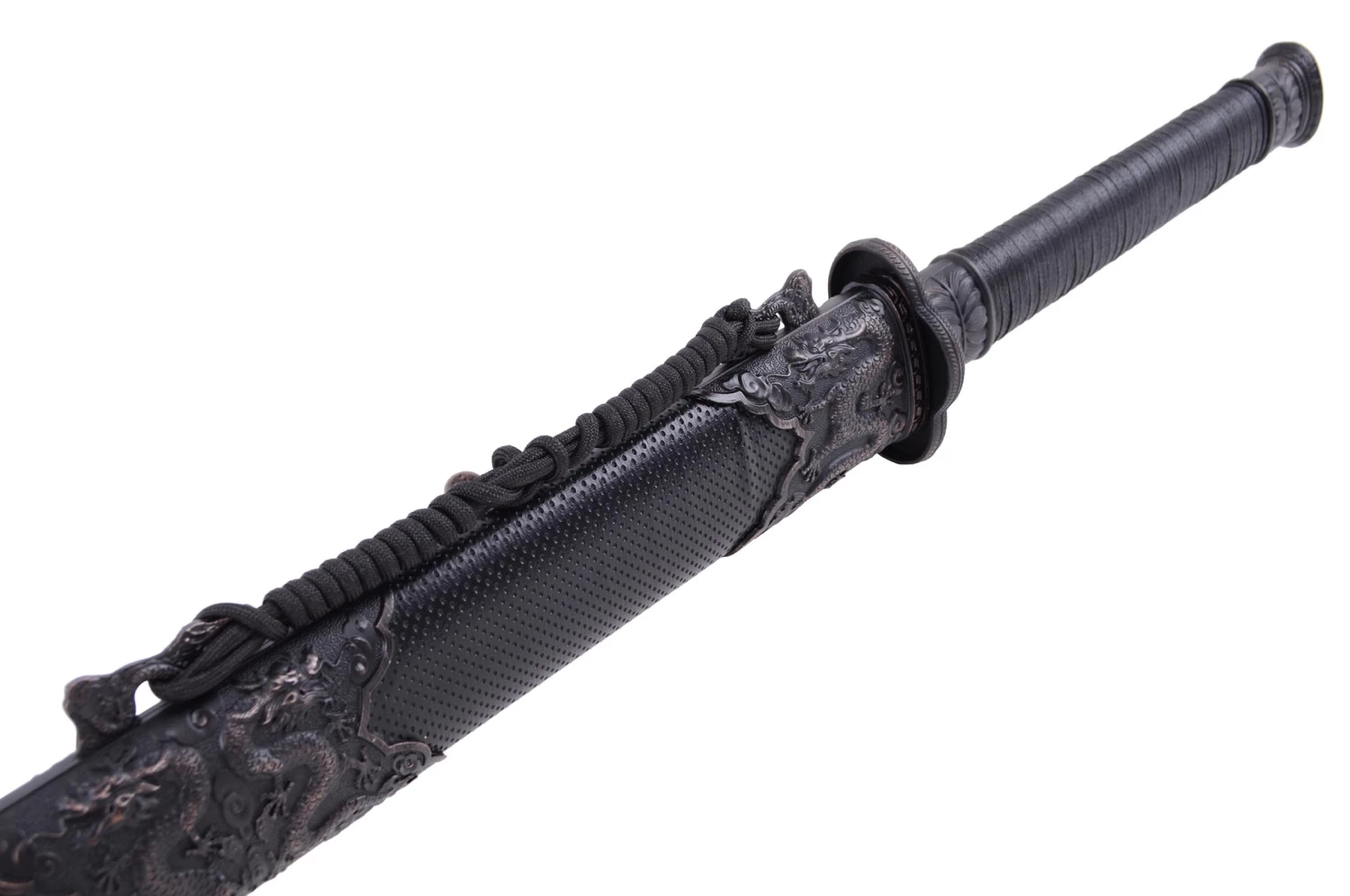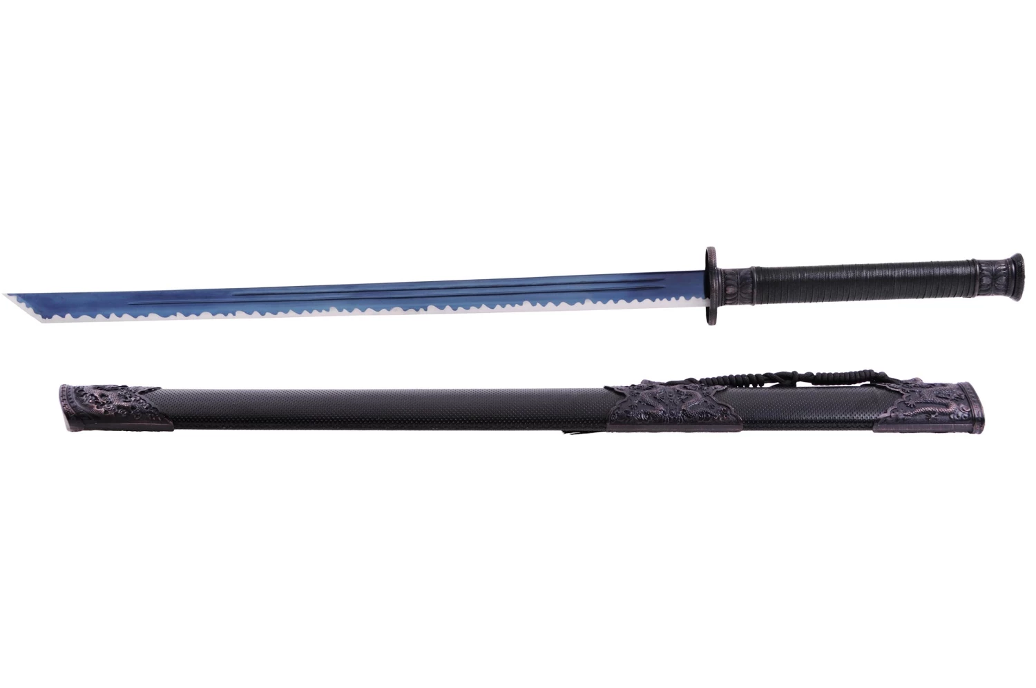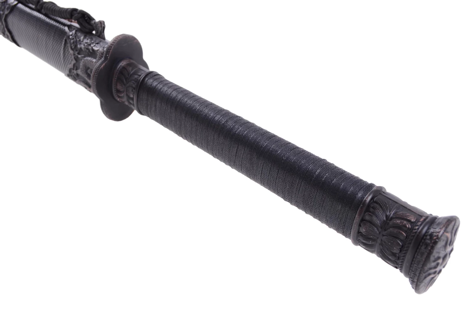 Ce katana possède une lame droite bleutée aiguisée à double gorges, un manche tressé noir orné en hauteur de feuilles de trèfles noir (Fushi) , une garde (Tsuba) noire en forme de trèfle et un magnifique fourreau (Saya) noir décoré de dragons.