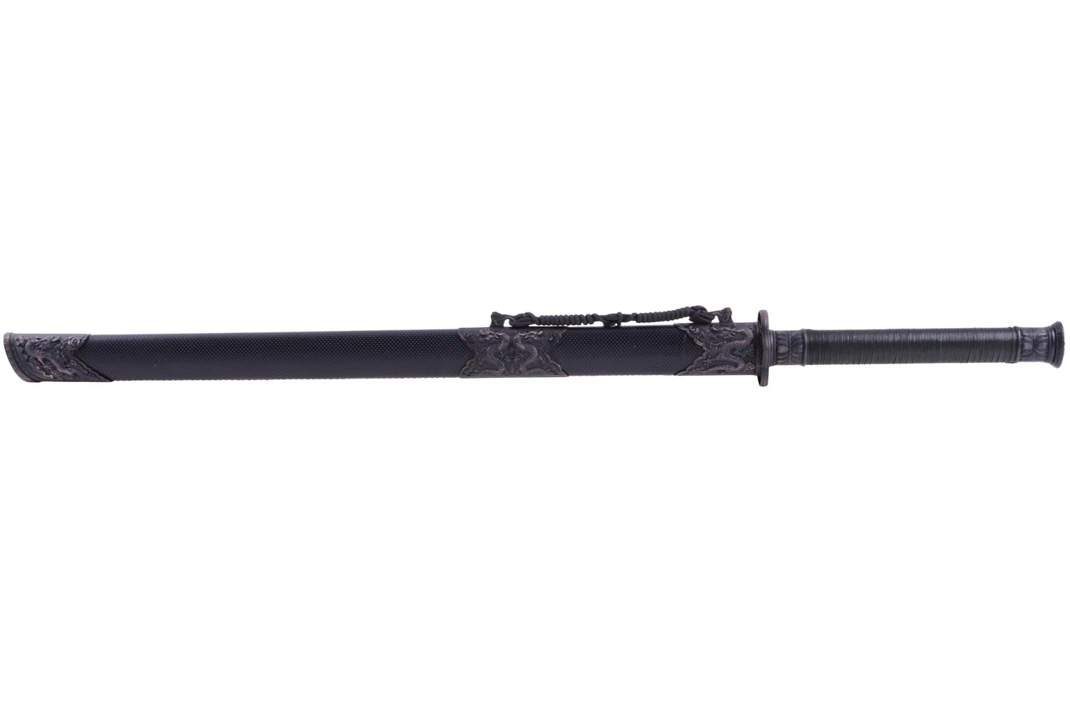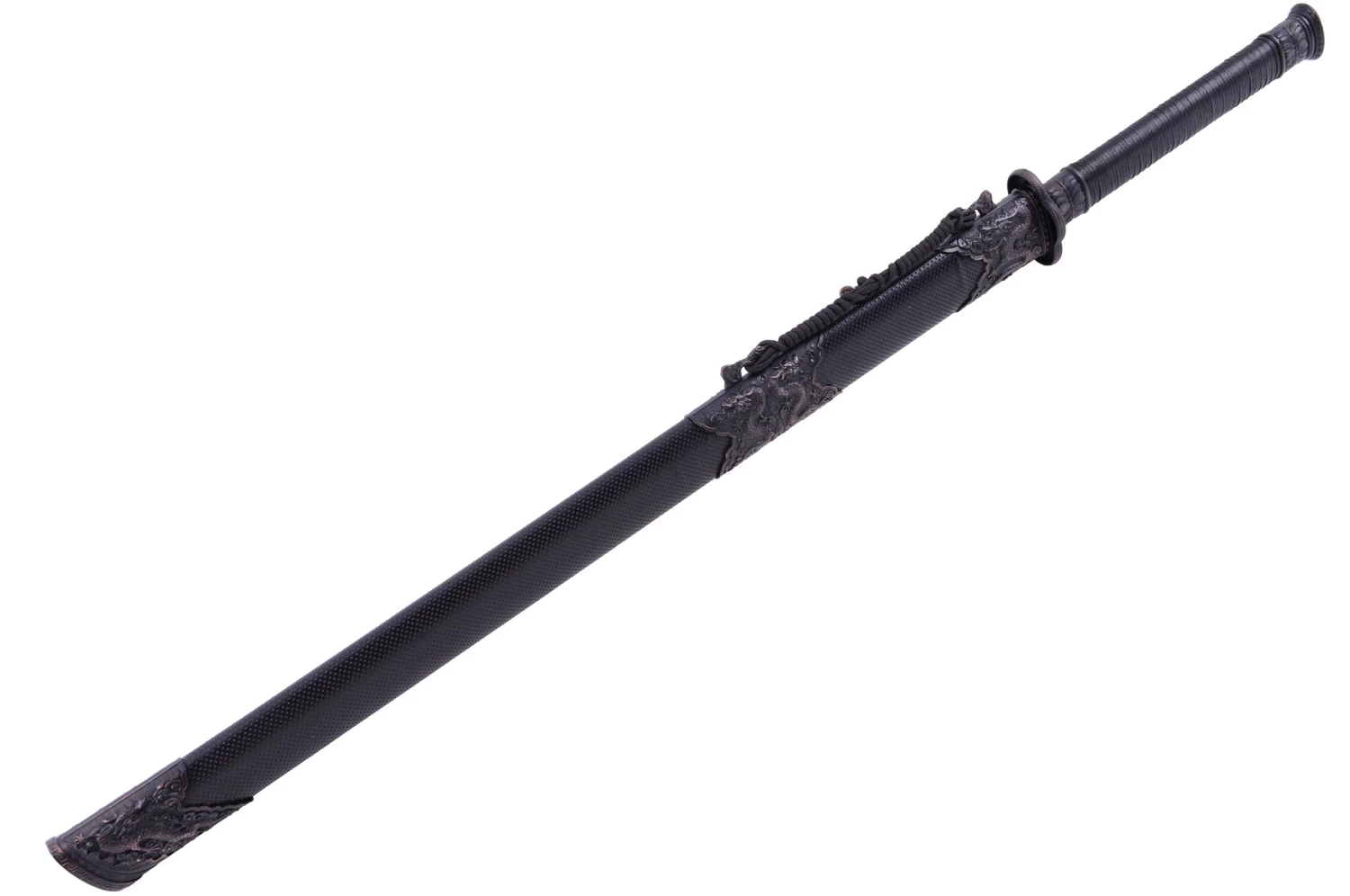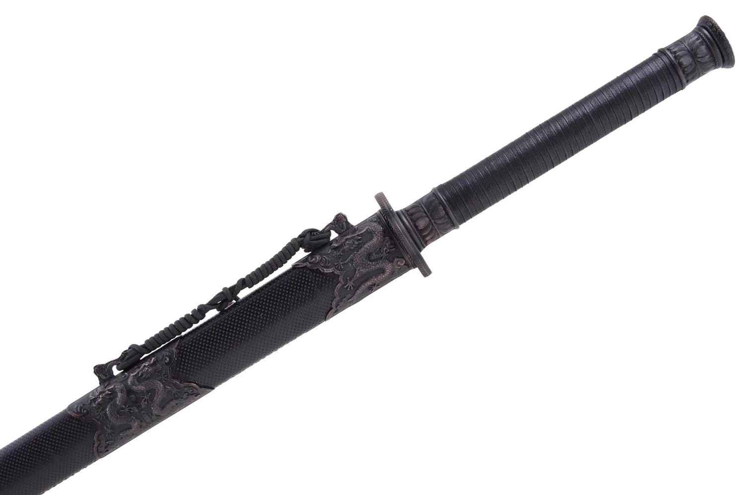 Ce katana possède une lame droite bleutée aiguisée à double gorges, un manche tressé noir orné en hauteur de feuilles de trèfles noir (Fushi) , une garde (Tsuba) noire en forme de trèfle et un magnifique fourreau (Saya) noir décoré de dragons.