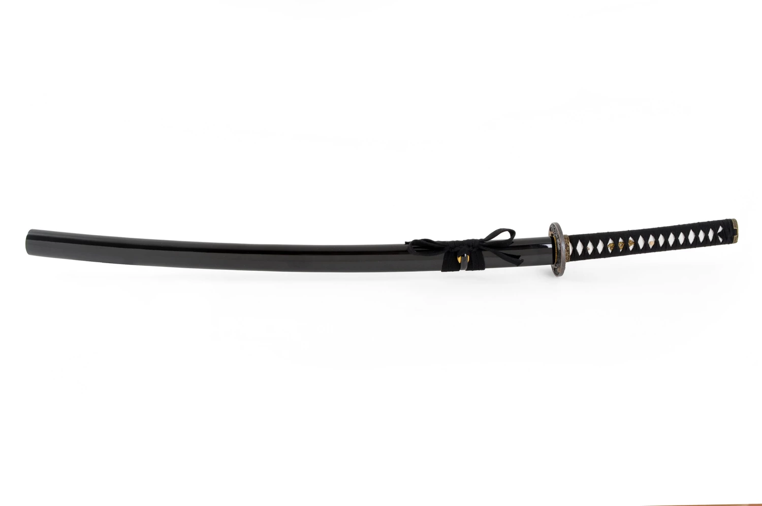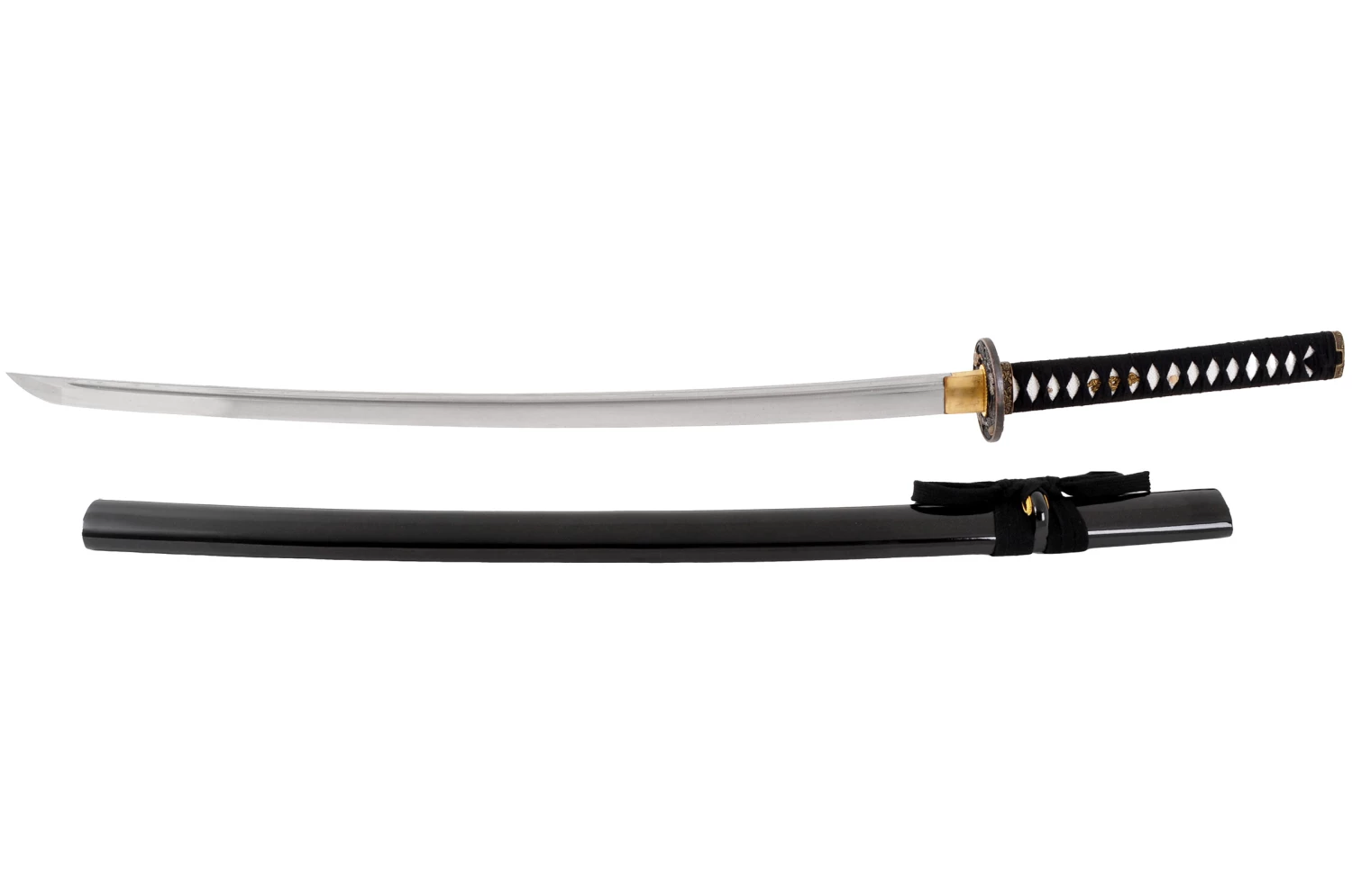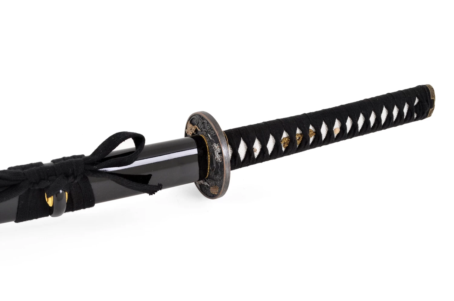 Ce katana possède une lame à gorge aiguisée, un manche au tressage noir, une garde (Tsuba) Noire avec décorations de nuages en Cuivre et un magnifique fourreau (Saya) en bois laqué.
