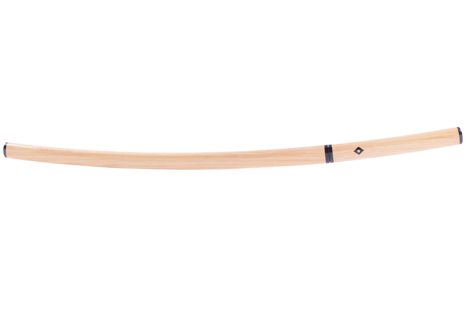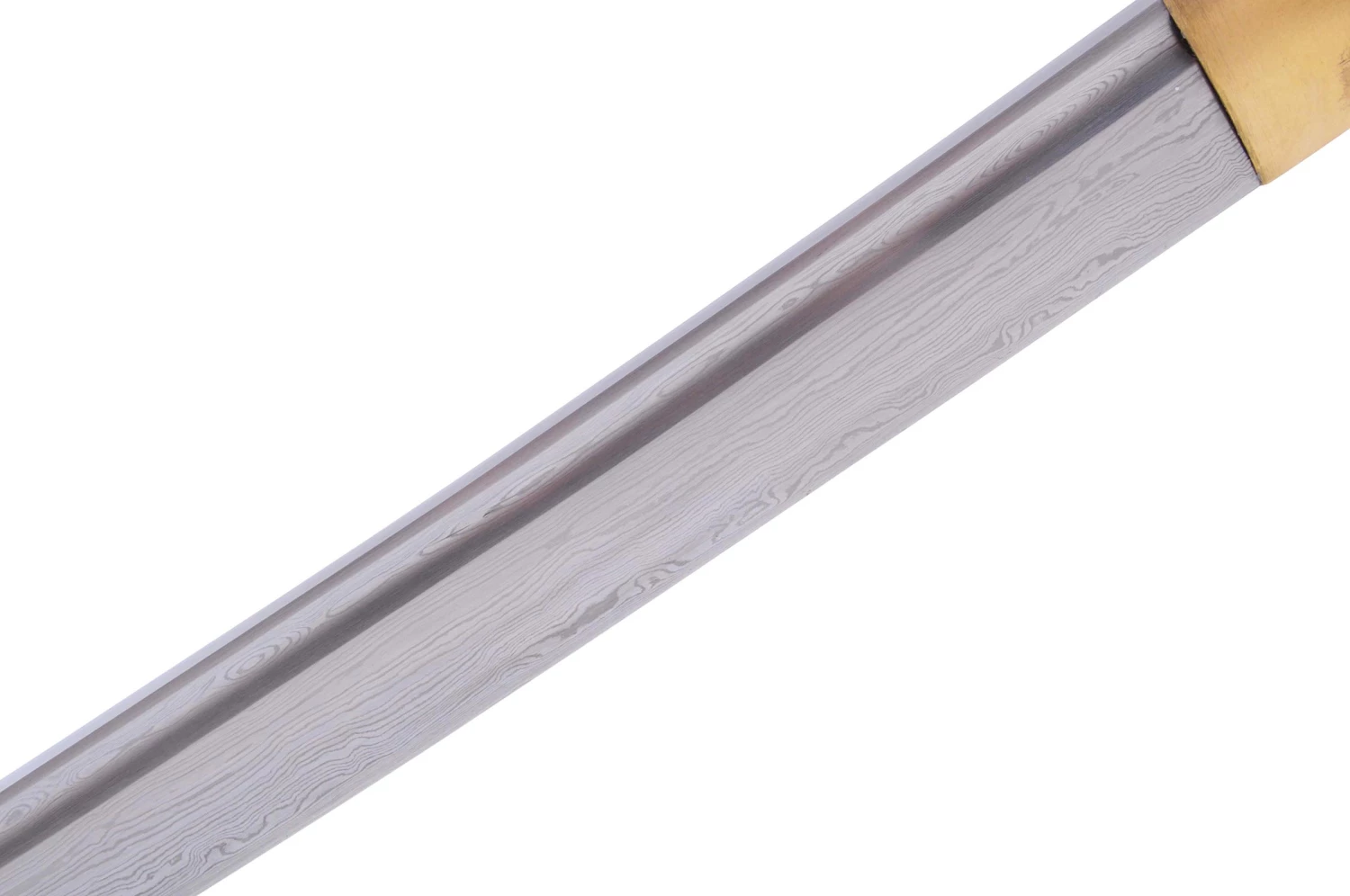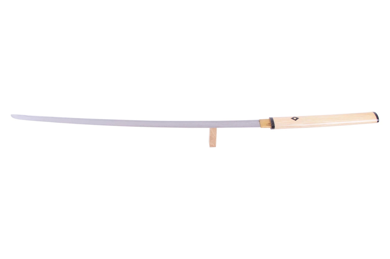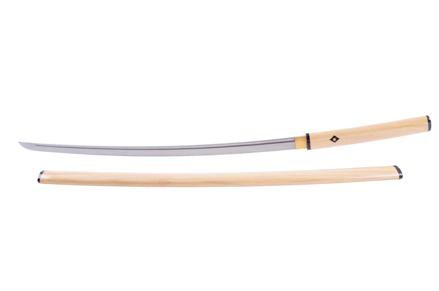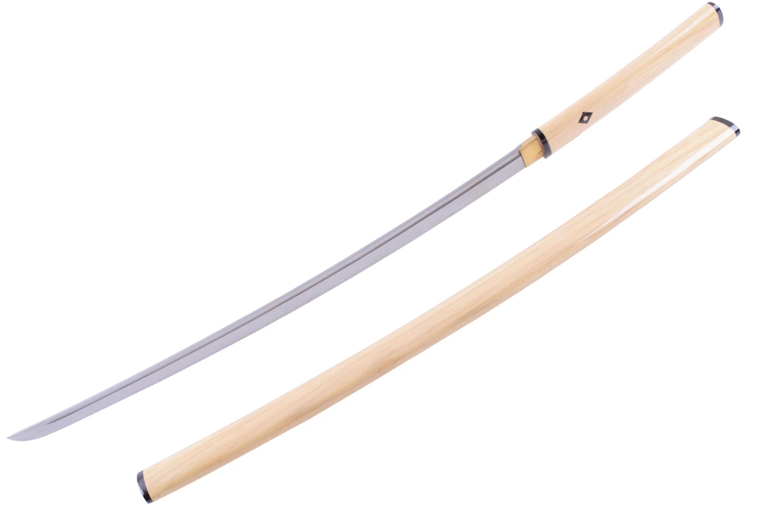 Cette arme possède une lame à gorge aiguisée, un manche (Tsuka) en bois naturel verni, un habaki doré et un magnifique fourreau (Saya) en bois naturel verni avec un losange noir.