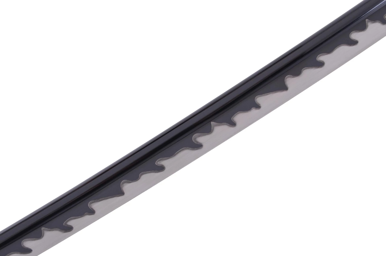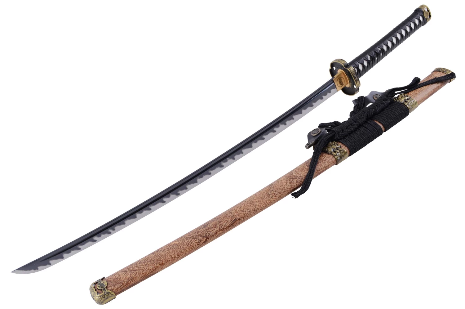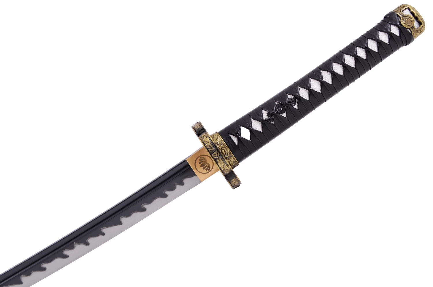 Ce Tachi à lame noire aiguisée possède un manche tressé noir et blanc avec en intérieur un Komainu noir (lion gardien issu de la culture japonaise), une garde finement travaillée en forme de trèfle aux décors fleuris et un fourreau (Saya) en bois naturel orné de Komainus couleur bronze aux extrémités du Sageo tressé noir. Ce Tachi est également muni d’un Koshirae noir aux inclusions de détails noirs.
