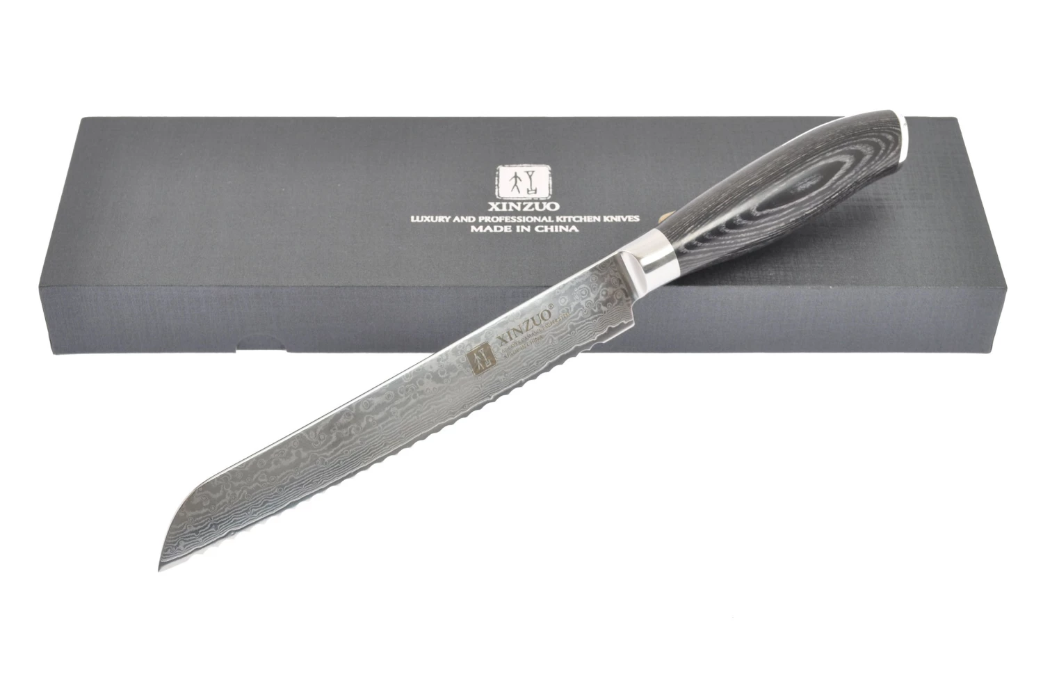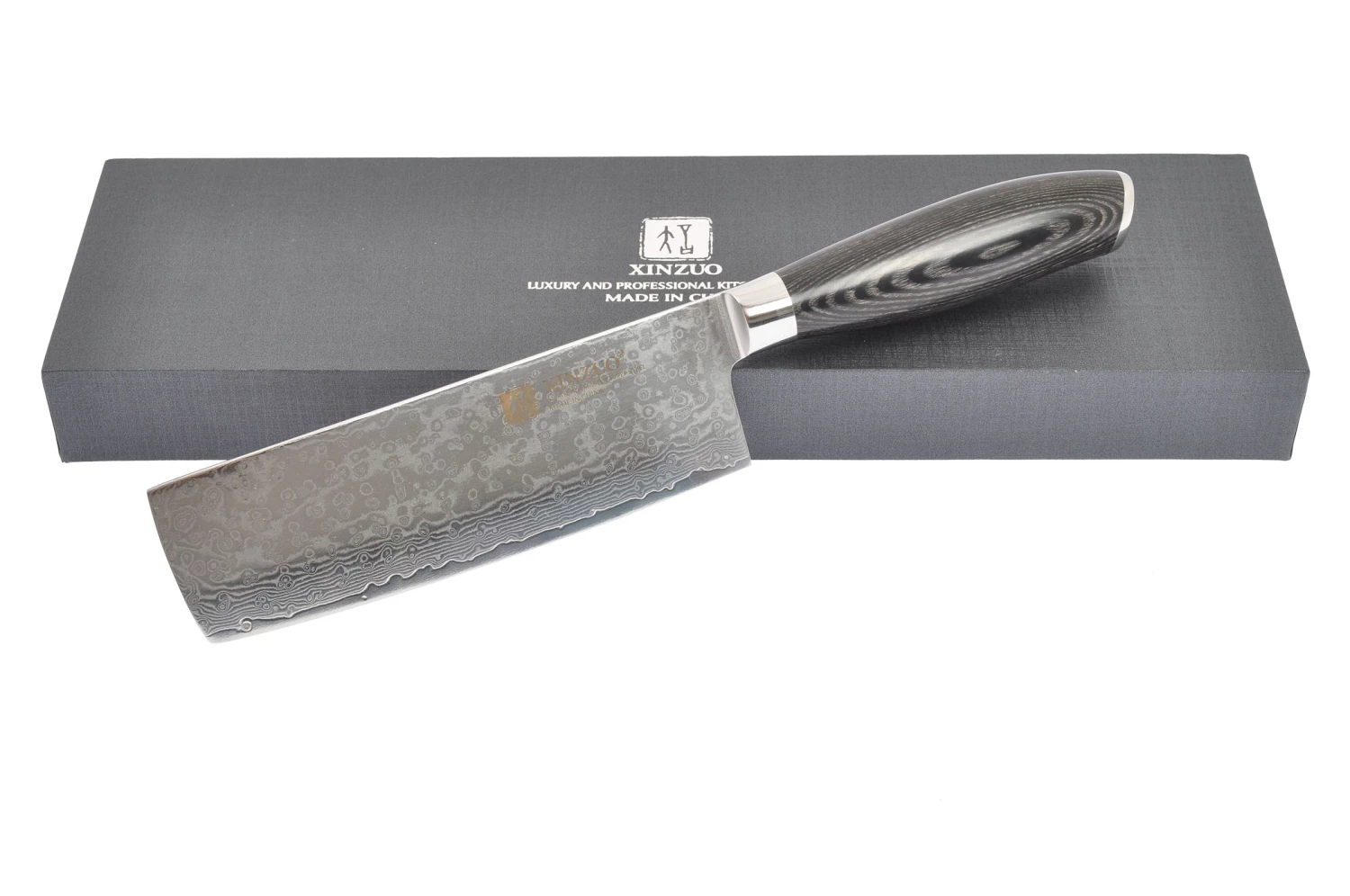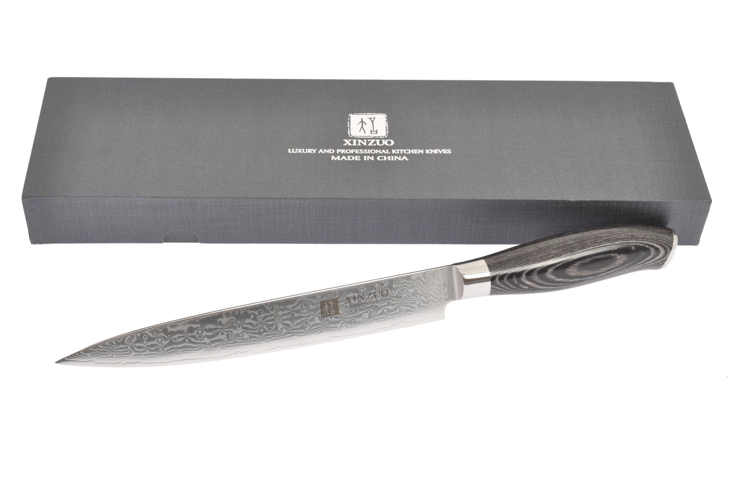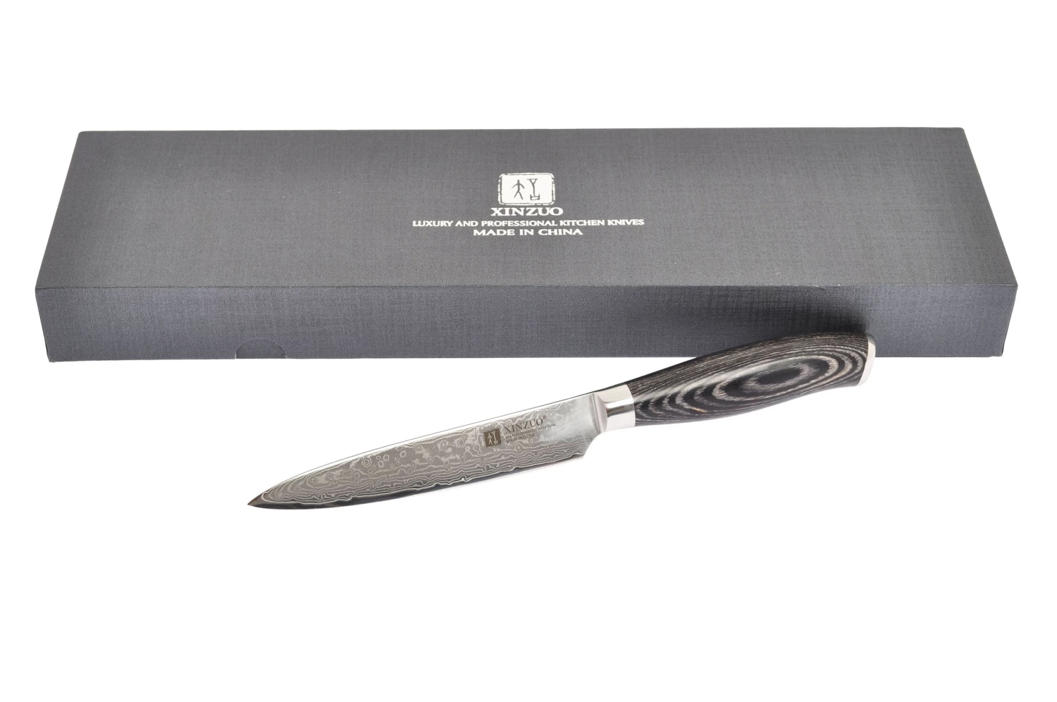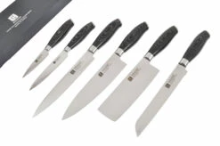 Lot de couteaux de cuisine haut de gamme, en acier feuilleté forgé (acier damas ou damascus) : une couche d’acier centrale en 10Cr15Mov (acier dur pour le fil de la lame), entourée de chaque côté par 67 couches d’acier pliées en forge (feuilleté). On peut voir les nervures du feuilletage sur la lame, ainsi que des reflets colorés grâce à la présence de cobalt dans l’alliage. La lame est très tranchante tout en étant très résistante (dureté 60+-2 HRC). Manche en résine moulée haute pression pour une solidité parfaite.