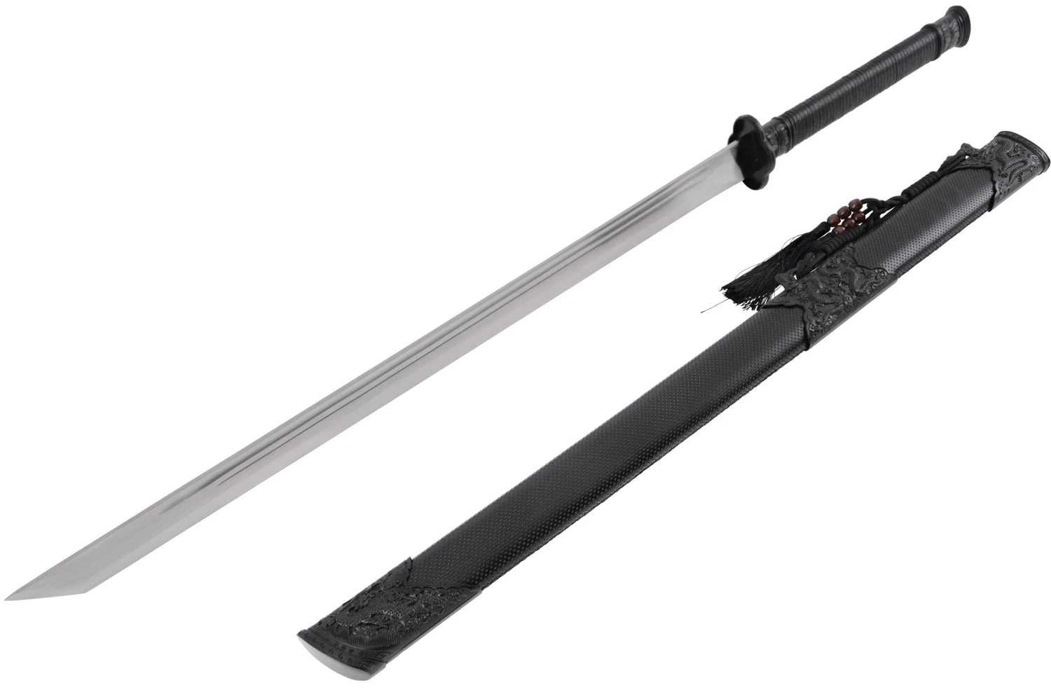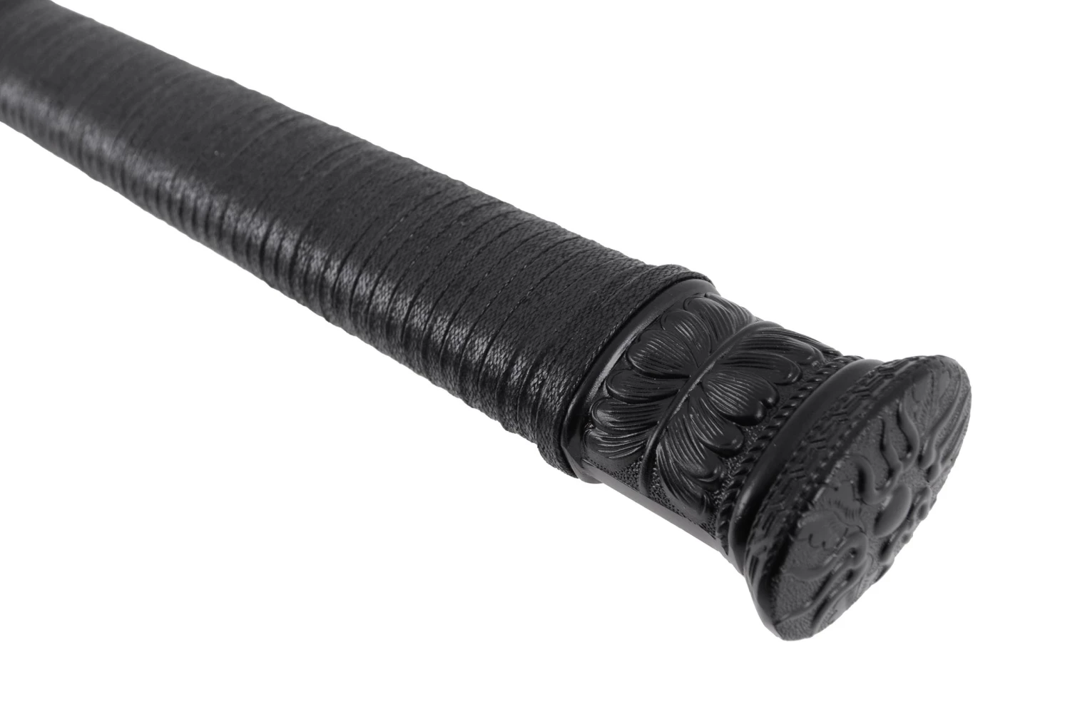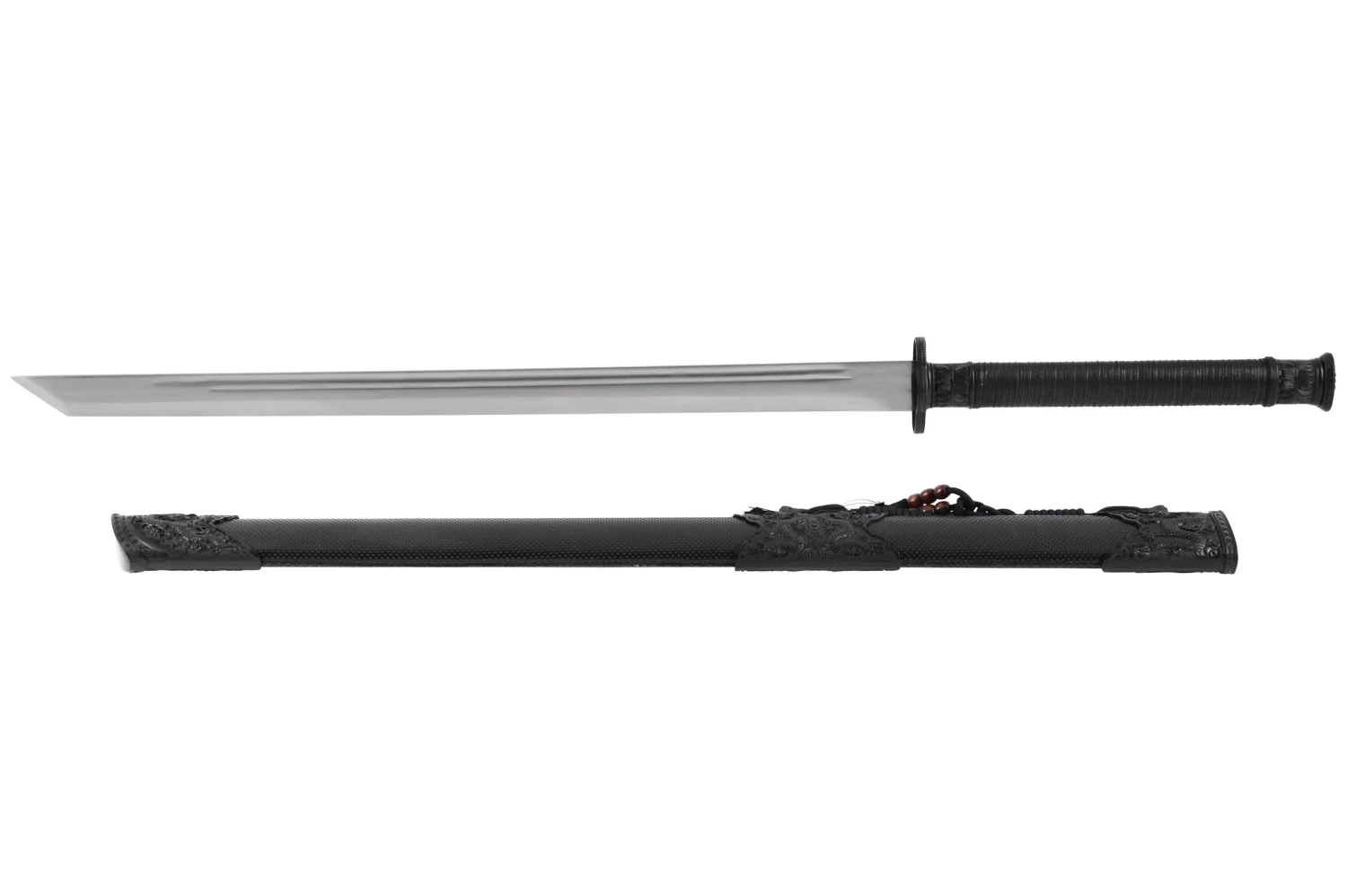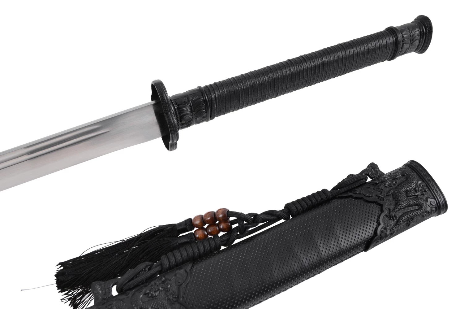 Son fourreau noir est recouvert d’une fine couche en simili cuir piqué et décoré de 3 parties ornementales aux dragons qui crachent leurs flammes. Il est, comme il se doit, embelli d’une corde et deux pompons avec des perles marrons, accrochées à leurs “kurigata” en forme de dragon.