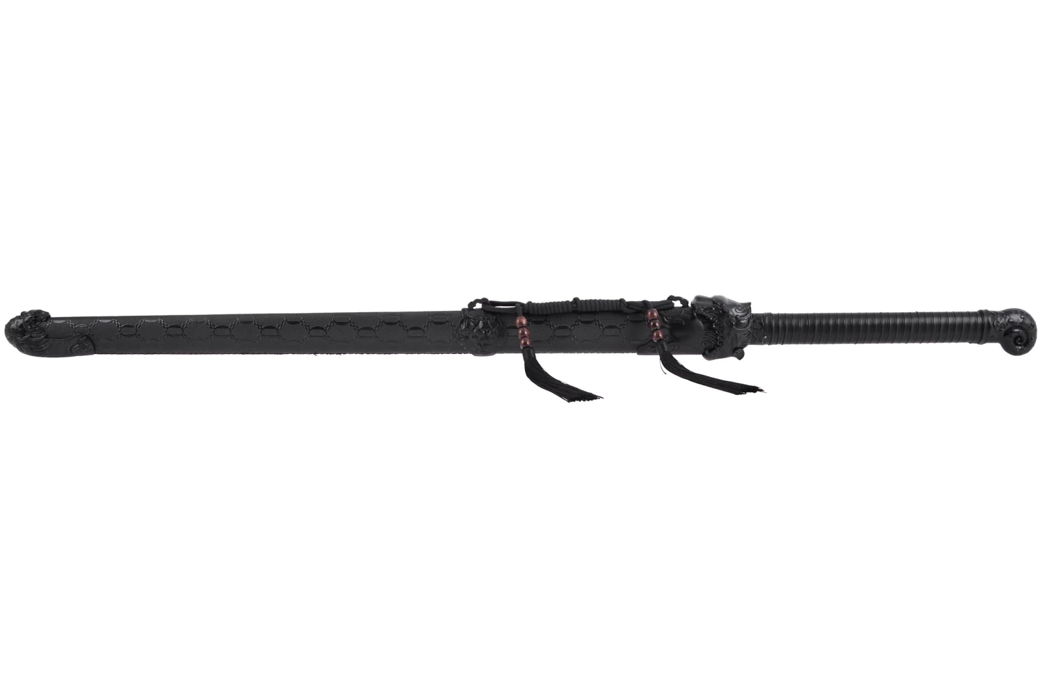 Son fourreau est en bois, recouvert d’une enveloppe en PVC noir aux motifs en relief rappelant des chaines croisées.